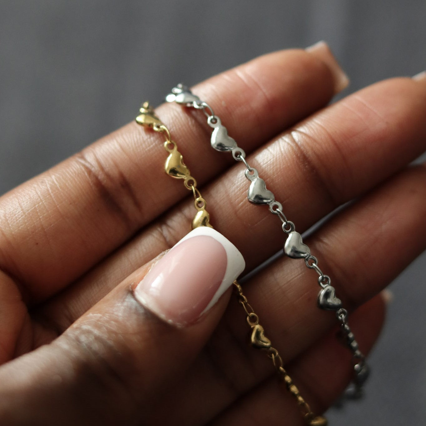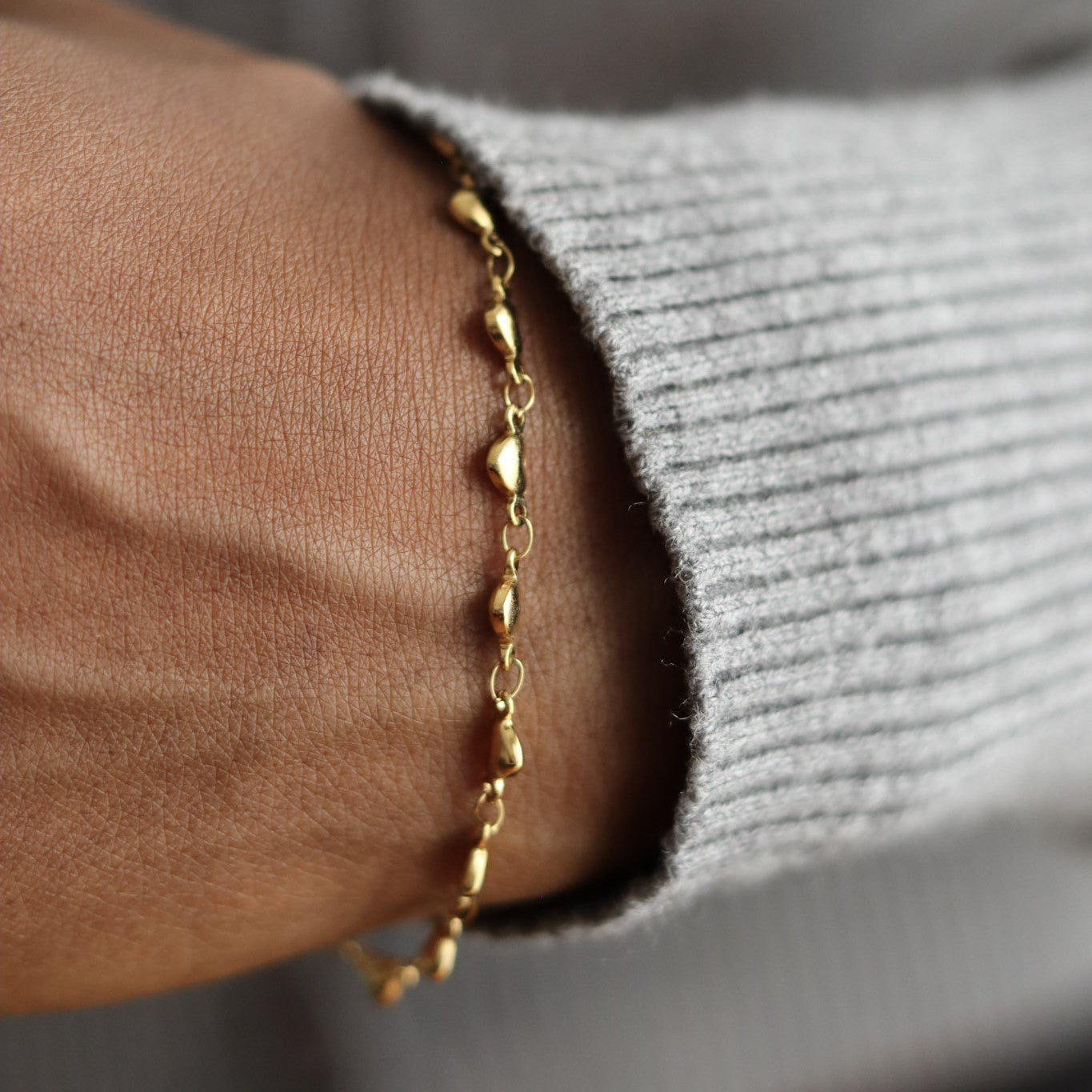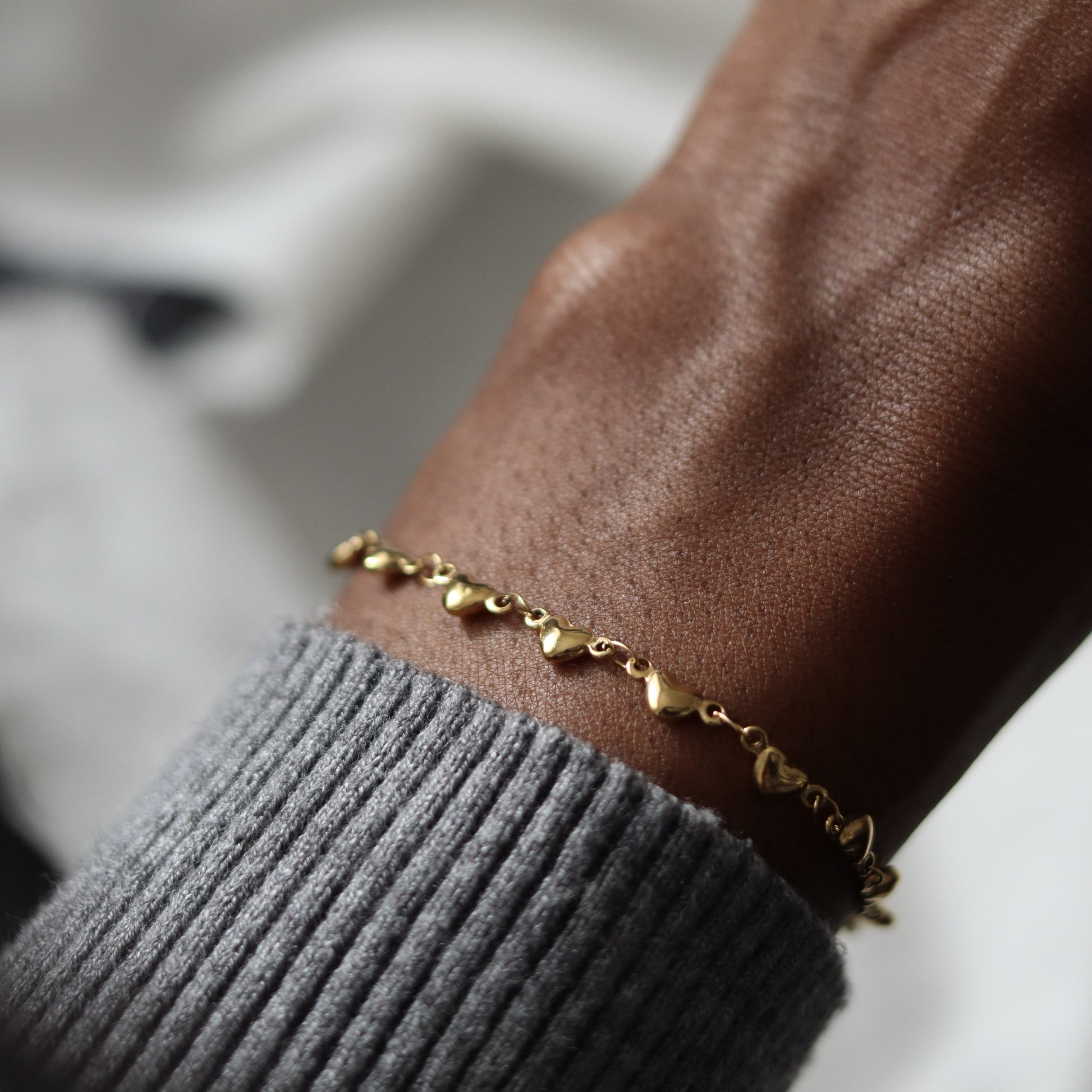 Das Armband Amanda ist ein zartes Herzarmband aus hochwertigem Edelstahl mit aneinandergereihten Herzen. Langlebig, süss und perfekt für jede Stack-Kombination.